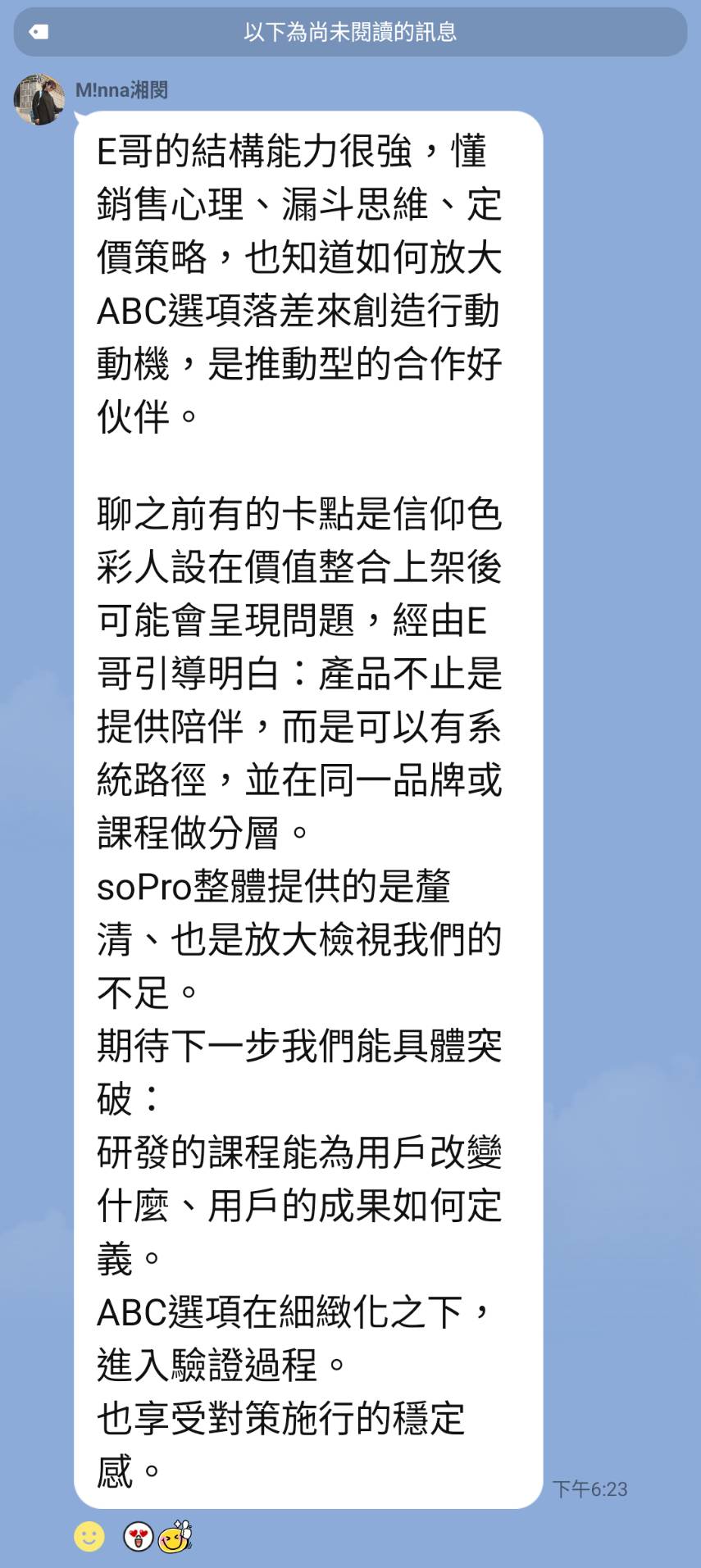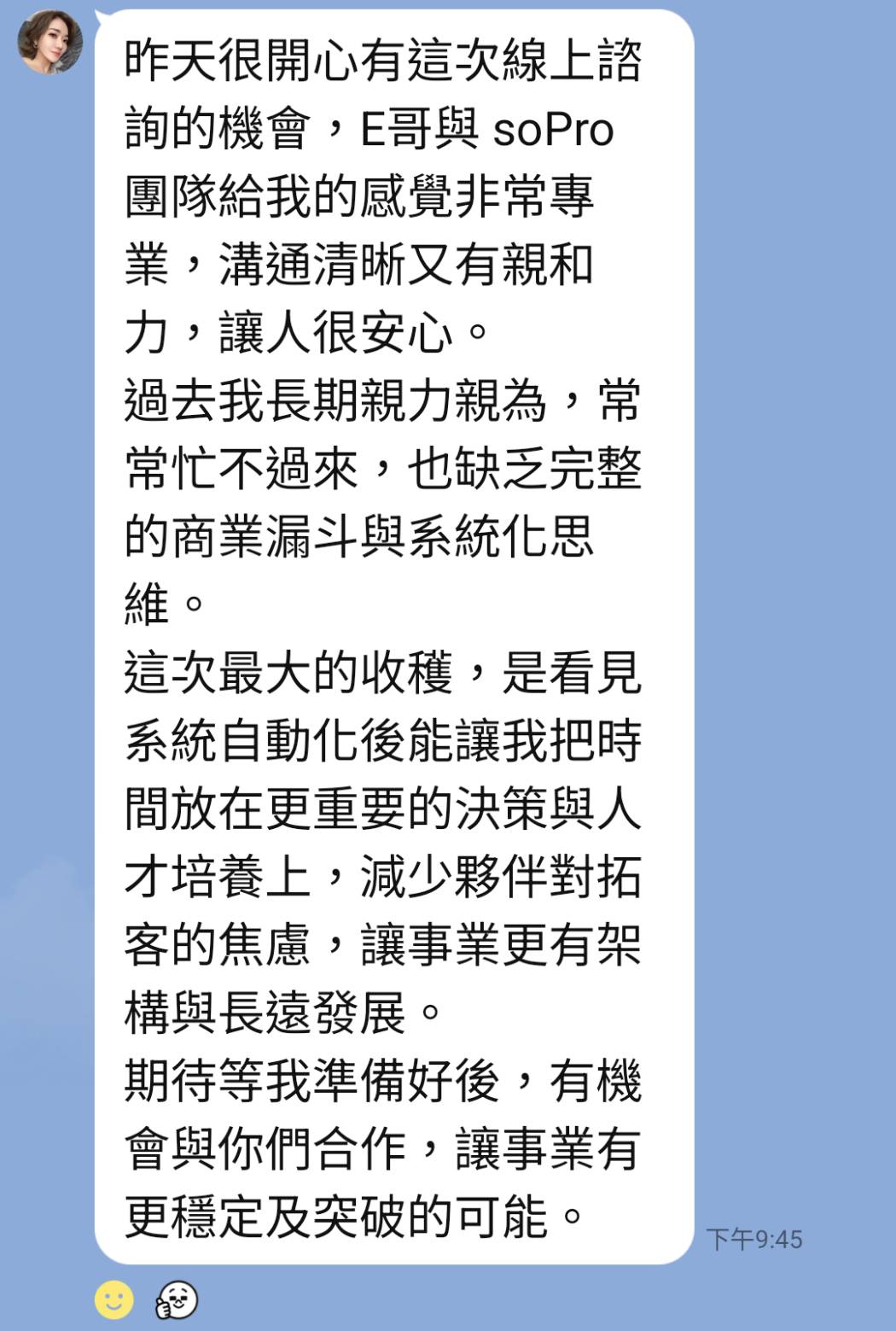 影片已解鎖,請觀看後完成申請 申請進度:50% ・ 合作詳細說明影片|限時48小時觀看 S級專家升級計劃 揭密:如何打破「用時間換報酬」的收入天花板,打造一套全天候自動運轉的「高價獲客系統」 不再為行銷和AI焦慮、不必強迫自己當網紅、更不用做課才能賣高價。 這段 10 分鐘的影片,將為你展示我們是如何透過 「soPro獲客成交系統」 ,協助像你這樣的S級專家,在 90 天~180天突破營收天花板,奪回生活主導權。 立即申請「S級專家」啟動會議 每月限額 3 名,請先觀看影片再申請 THE DELIVERABLES — 交付內容 當你成為我們的合作夥伴,我們將為你建置... 模組一:高價賽道定位與服務重組 協助你將既有的專業服務流程,重組到高價賽道定位。把容易被比價的「單次服務」,升級為無法被比價的「高價解決方案 (High-Ticket Offer)」,讓你不再陷入低價競爭。 模組二:導入「soPro AI行銷官網」 我們直接提取你的專業邏輯,將整套銷售與接待機制植入價值 $98,000 的官網系統。專家將擁有多對一的營運服務團隊,給予你隨時的支援,讓你的專業可以無限複製。 模組三:主動式精準獲客引擎 告別被動等待轉介紹,我們為你導入一套主動式的流量獲取機制。不論市場如何變動,這套機制能持續鎖定對你主題感興趣的受眾,將源源不絕的「精準名單」自動注入你的漏斗。 模組四:自動培育與過濾機制 名單進來後,系統會先透過自動化內容進行價值培育,建立信任;接著透過資格審查問卷過濾掉「問問哥」,確保預約你時間的都是優質準客戶。 模組五:多元收款與售後引導 我們幫你串接「信用卡分期、無卡分期」等工具,降低高價服務門檻。付款後,系統自動寄出成功信和下一步指引,省下你反覆確認與溝通的時間。 BONUS:soPro 營運團隊 我們不是外包商,是你的合夥人。透過分潤模式,我們將彼此目標綁定,致力於最大化你的營收成長。我們就是你的「經紀團隊」,讓你專注在舞台上發光。 WHY APPLY NOW — 申請獎勵 即使最後評估暫時無法合作,申請「啟動會議」你也能獲得價值$16,000元的好禮... Bonus #1:TOWS 市場策略報告書 價值 $10,000 我們會在會議前親自研究你的市場,為你找出獨特切角與機會點,這份報告直接送給你。 Bonus #2:5步驟高價漏斗拆解教學影片 價值 $6,000 這是我們為客戶建置系統的執行藍圖 SOP,即使不合作,你也可以照著這份教學嘗試自己搭建。 別再用你的「時間」換取微薄的「薪水」 立即申請「S級專家」啟動會議 每月限額 3 名,請先觀看影片再申請 來自 E哥 的提醒: 正如我在上一頁所說,我也曾經是個「校長兼撞鐘」的窮忙專家,深知那種痛苦。 因此,我們只尋找真正準備好要改變的夥伴。點擊按鈕後,請完成一份包含11 道關鍵題的評估問卷。請務必用心且詳細填寫,因為這不僅是我們評估合作的基礎,更是決定你將獲得的這份TOWS 市場分析報告 是否精準的重要關鍵。 只有在詳細填寫完成後,系統才會跳轉至 Calendly 開放預約時段。 如果你已經準備好要將事業升級,奪回時間主導權,我們會議上見。 立即申請「S級專家」啟動會議 來看看參與過我們會議,以及參加過我們計劃的專家們怎麼說...